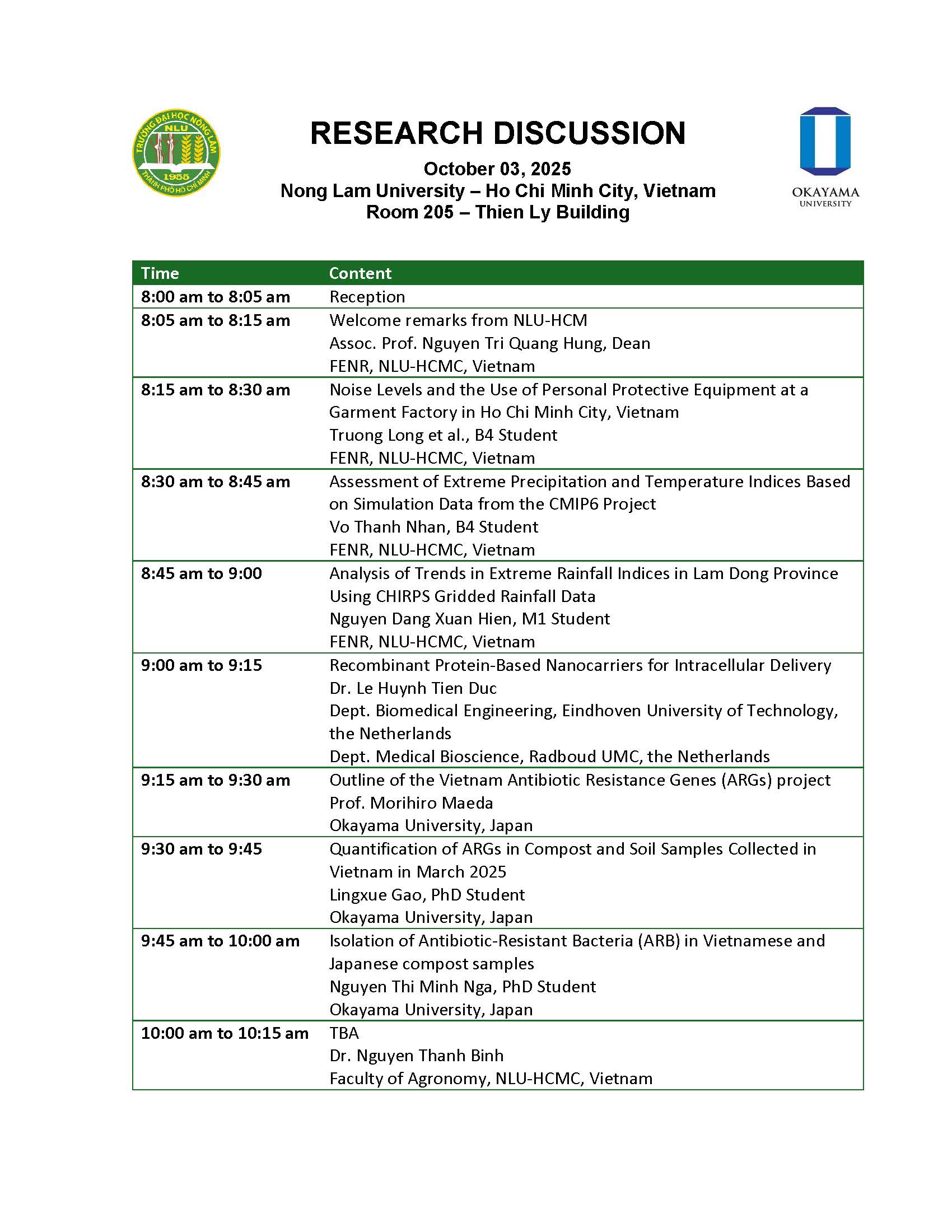 Trong khuôn khổ hợp tác giữa Trường Đại học Nông Lâm TP. Hồ Chí Minh (NLU) và Đại học Okayama (Nhật Bản), hai bên phối hợp tổ chức Buổi Thảo luận Nghiên cứu Khoa học (Research Discussion) với mục tiêu tăng cường kết nối học thuật và hợp tác nghiên cứu quốc tế. Sự kiện sẽ diễn ra vào sáng ngày 03/10/2025 tại Phòng 205 – Nhà Thiên Lý, Trường Đại học Nông Lâm TP. Hồ Chí Minh.
